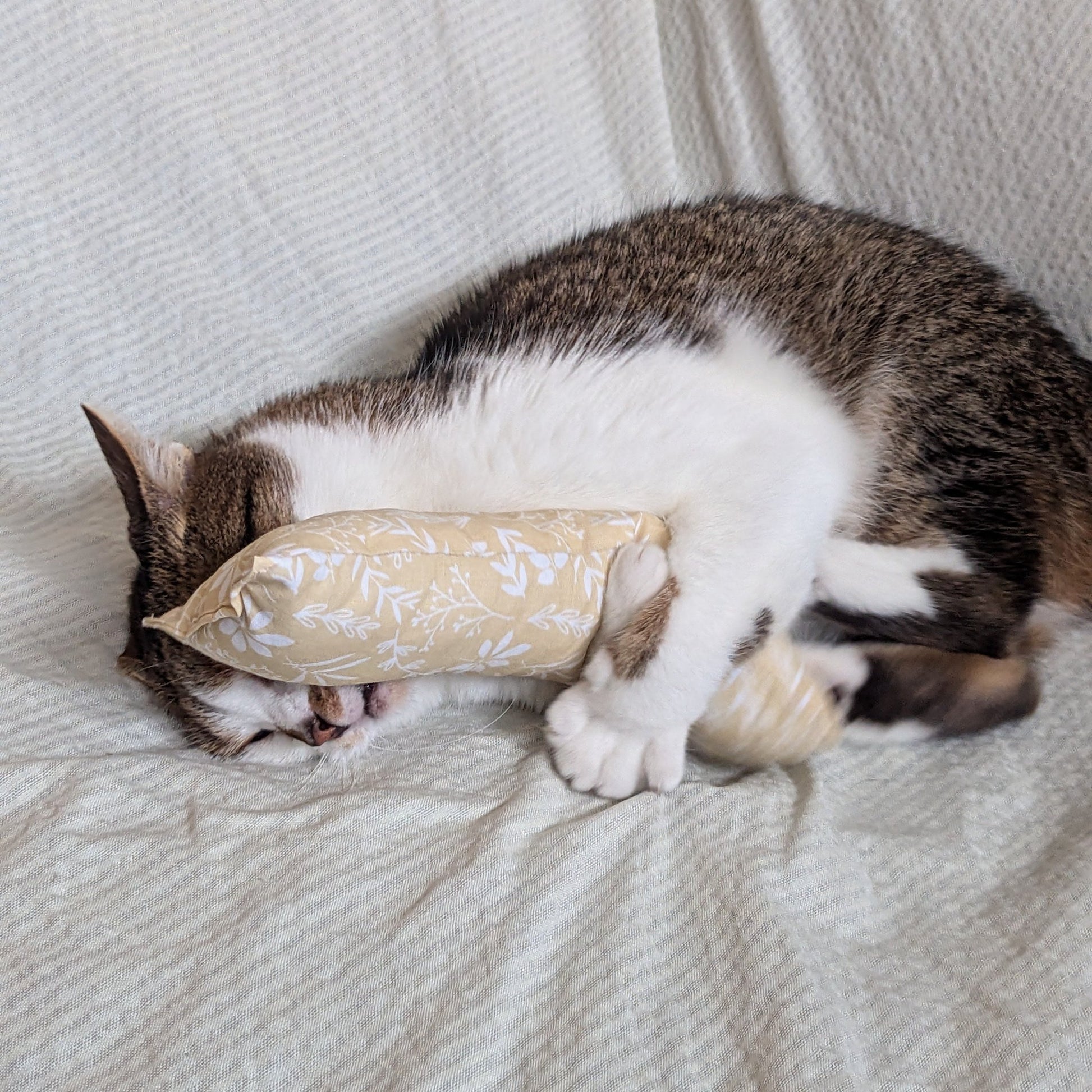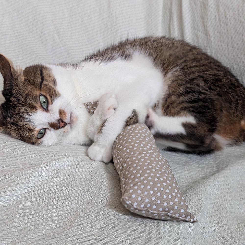 Tolles Spielkissen für Katzen. Kickrolle aus Baumwollstoff mit duftender Katzenminze, animiert zum Treten, Kicken und Toben. Durch die längliche Form wird der Jagdinstinkt der Katze geweckt.